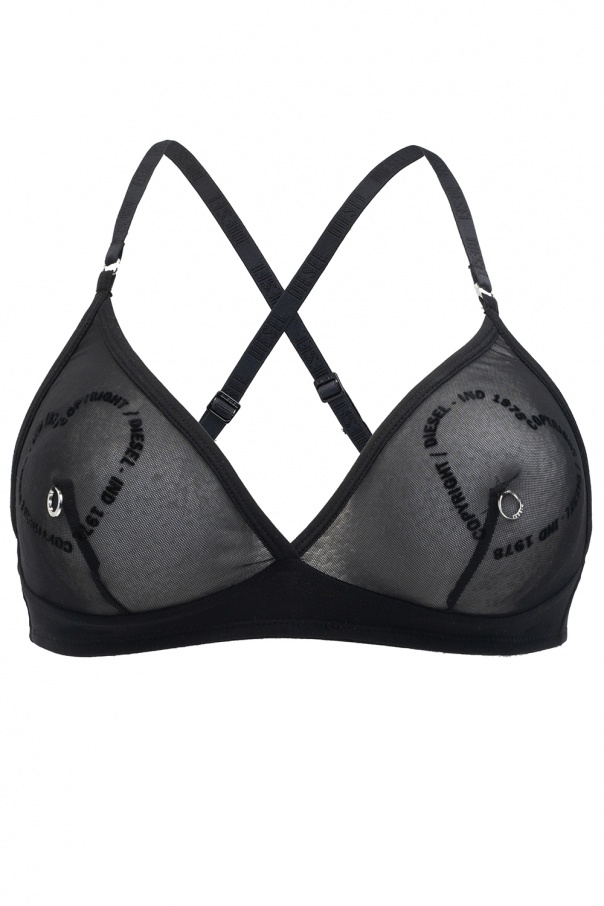 Black bra from Diesel. Crafted from semi-sheer material, this style secures with a hook & eye closure on the back and showcases adjustable shoulder straps, a silver-tone branded metal hardware and embroidered typography details.