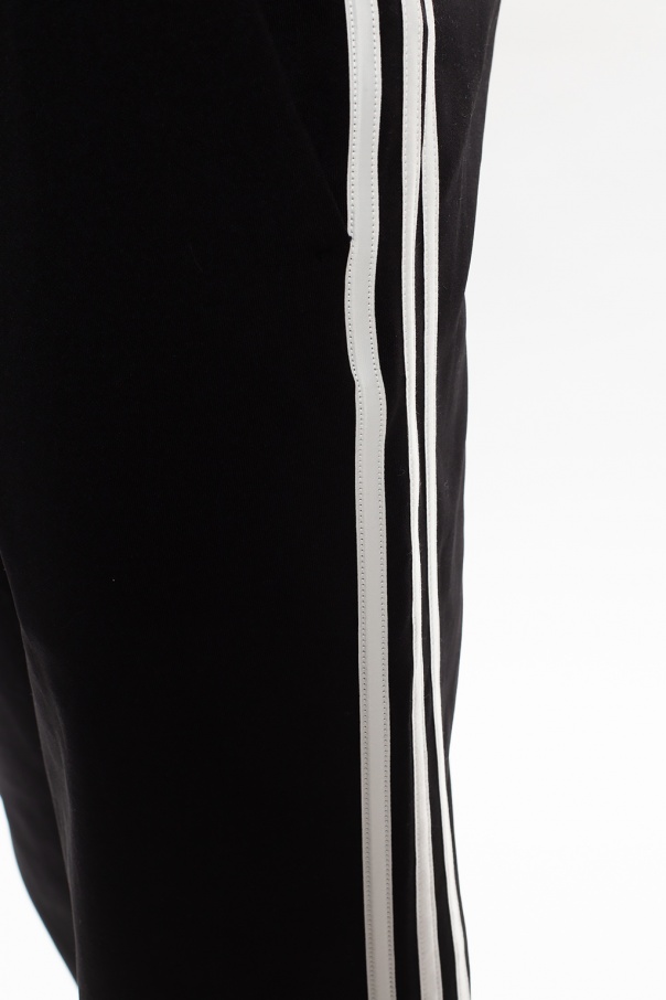 Black sweatpants from Y-3 Yohji Yamamoto. This design features a drawstring waist, three stripes down the sides, two slip pockets and one zip pocket on the front, back zip pocket and ribbed cuffs.