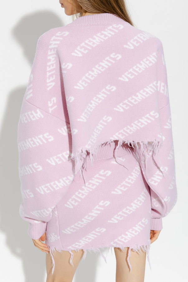 Pink and cream crewneck sweater from VETEMENTS. Made of wool with a regular fit, this style features a logo pattern, long sleeves and a raw hem.