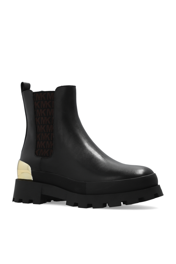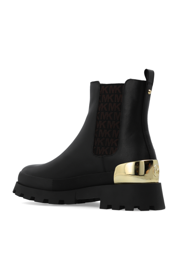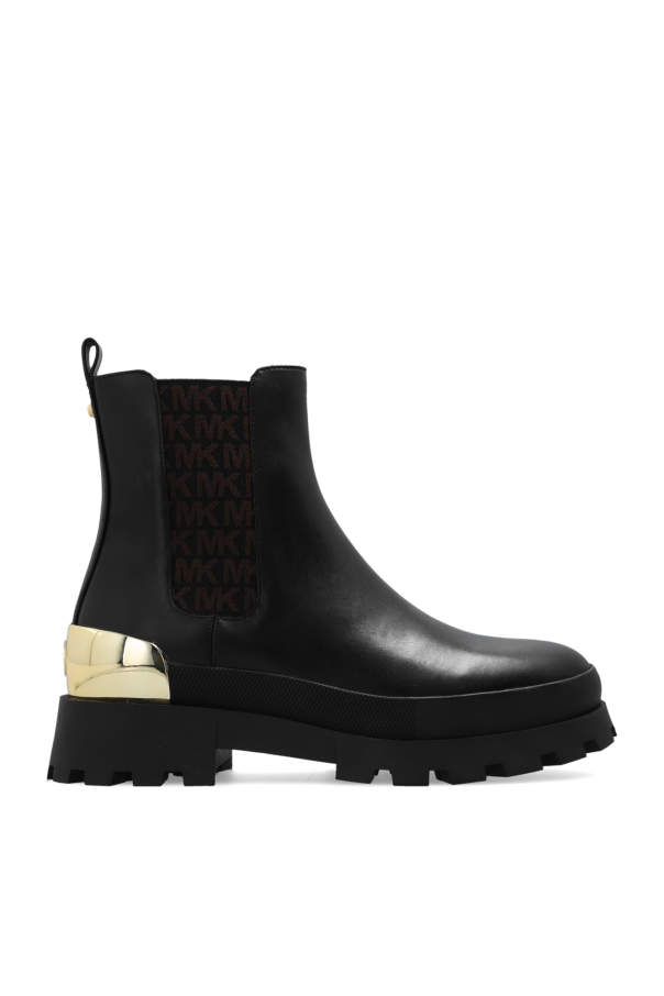 Black ‘Rowan’ ankle boots from Michael Michael Kors. Made of leather with a pointed toe silhouette, this model sits on a black rubber sole and features gold-tone monogram hardware on the back and elastic panels with brown logo embroidery on the sides.