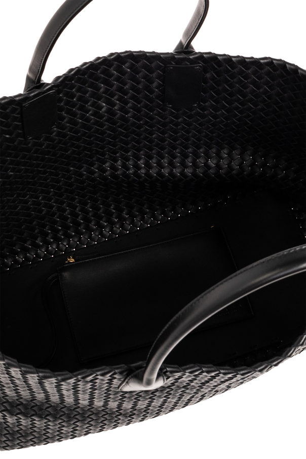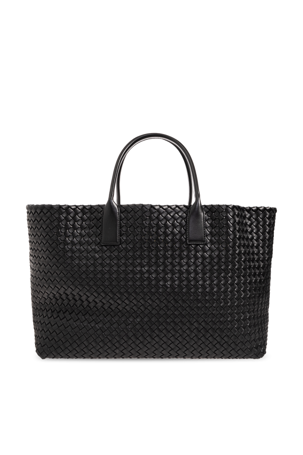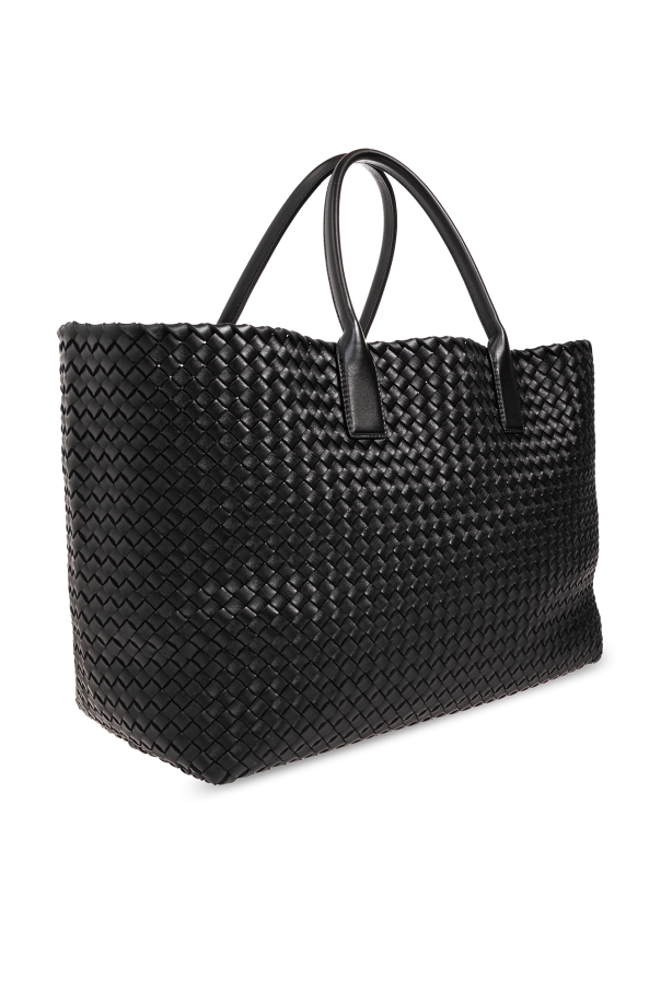 Black ‘Cabat Large’ shopper bag from Bottega Veneta. Made from lamb leather with the brand\'s signature ‘Intreccio’ weave, this design features two half-round handles, antiqued gold-tone metal hardware and one internal compartment with a removable zip pouch.