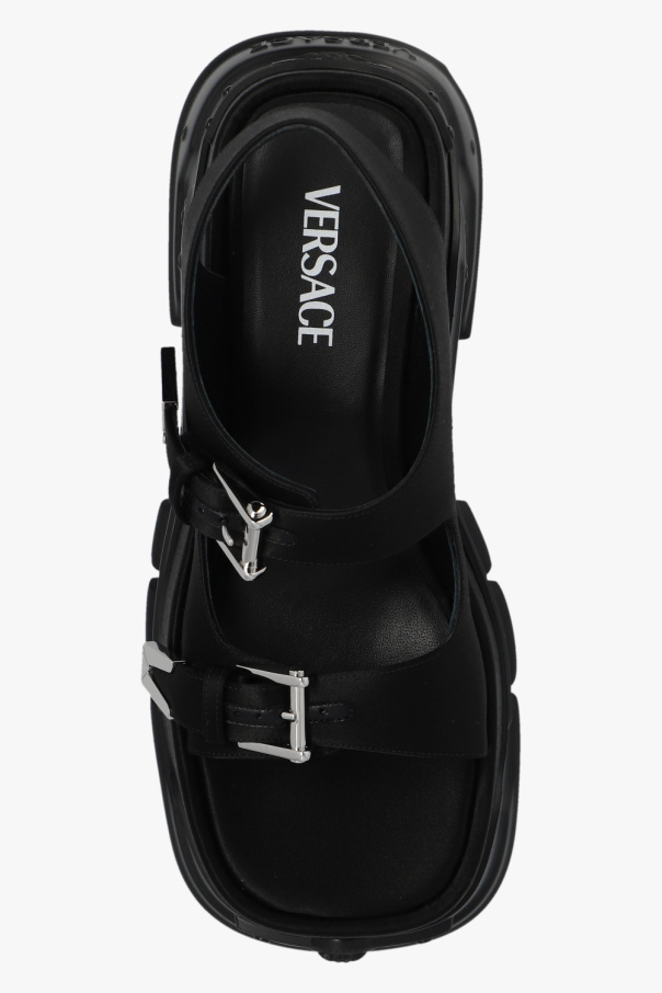 Black ‘Medusa Anthem’ platform sandals from Versace. Made of fabric, this pair features adjustable straps with silver-tone buckles and a black rubber sole with the brand’s signature Medusa head.