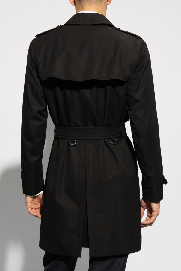 Beige trench coat from Burberry. Made of cotton with a double-breasted silhouette, this style features a buckle belt, button fastenings, two slip pockets, shoulder epaulettes and long sleeves.