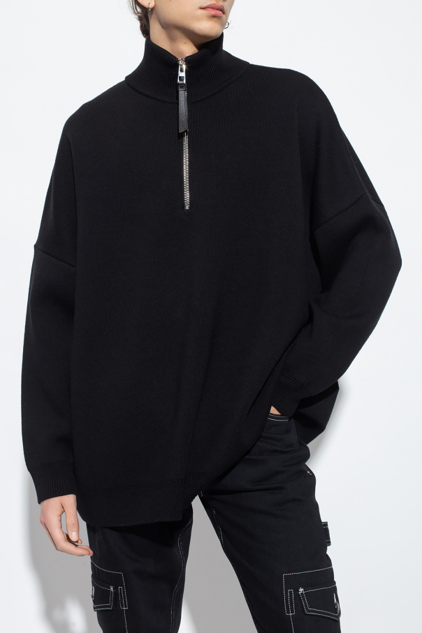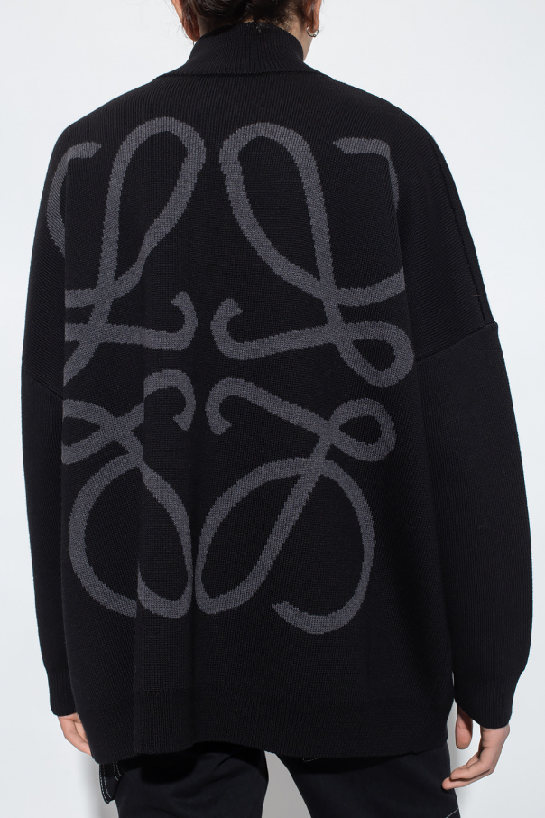 Black sweater from Loewe. Made of wool, this style features a standing collar with a quarter-zip closure, an embroidered grey logo on the back and ribbed trims on the bottom hem and cuffs.