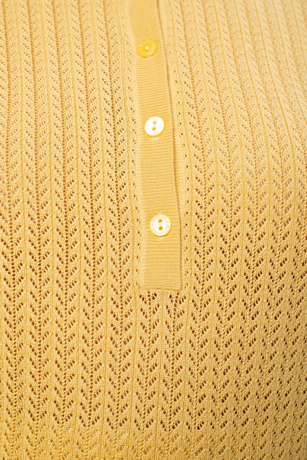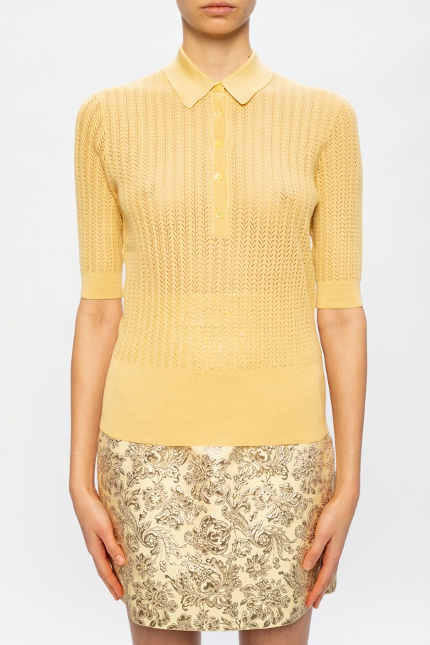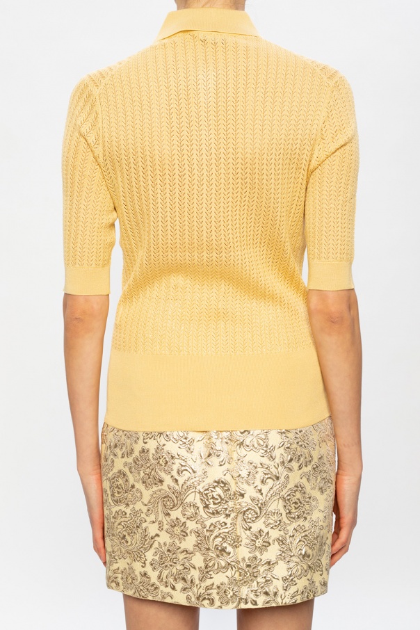 Yellow polo shirt from Dolce & Gabbana. Featuring an openwork silk construction, this style fastens via buttons and is complete with ribbed trims at the bottom hem and cuffs.