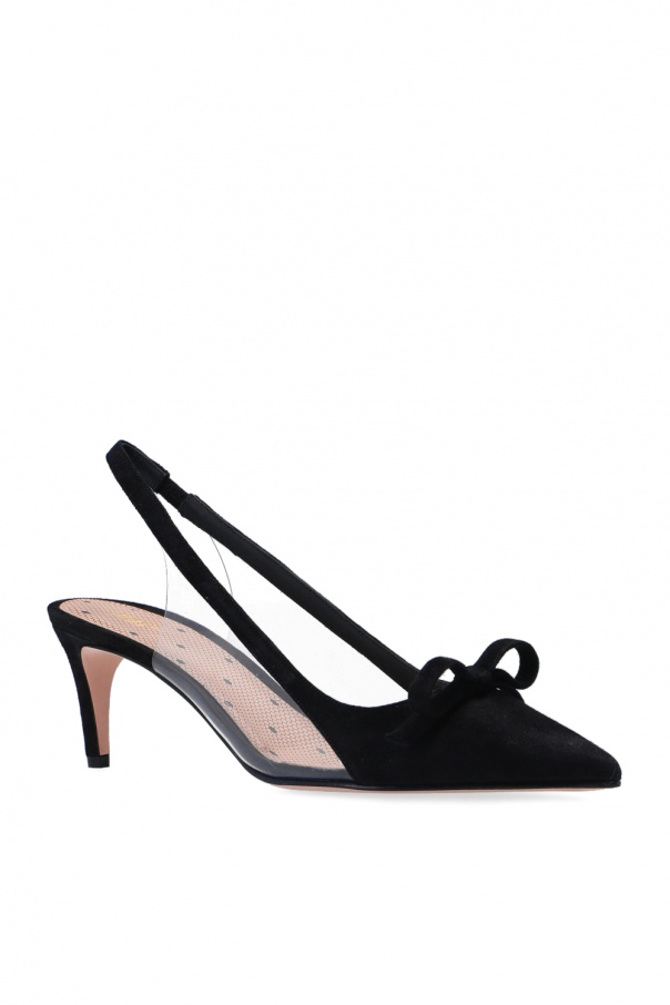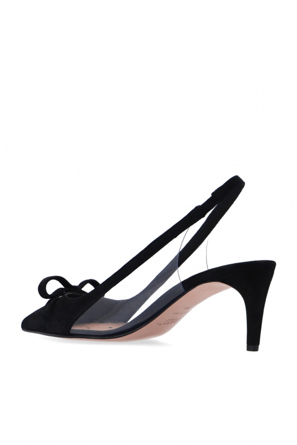 Black stiletto pumps from Red Valentino. Crafted from suede, this slip-on design features transparent inserts on the sides, a bow, an open heel and a beige leather sole.