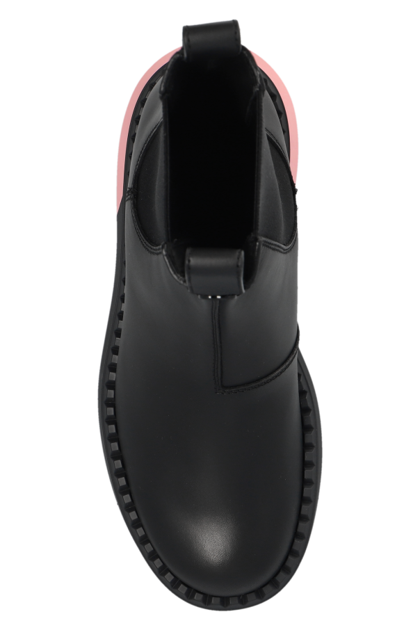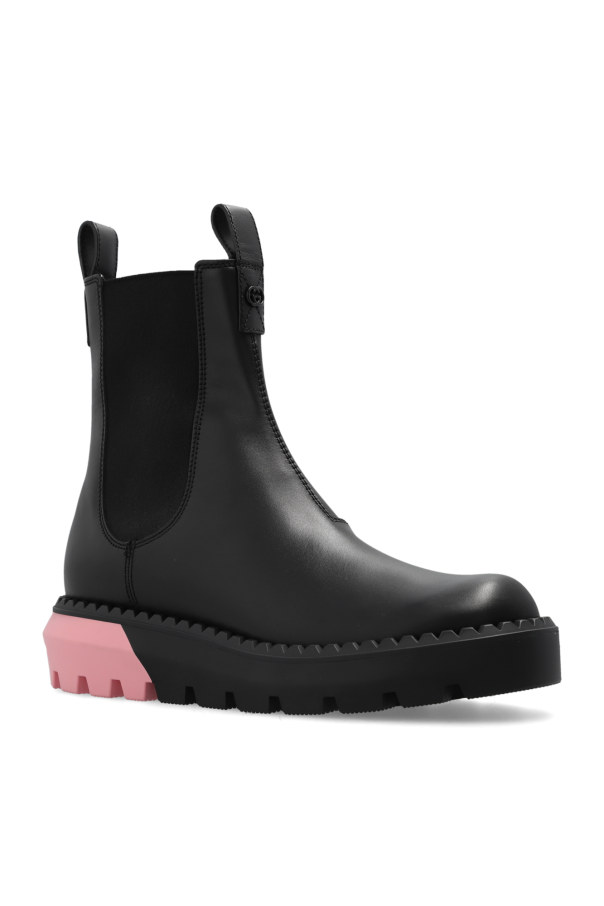 Black ankle boots from Gucci. Made of leather, this model sits on a black and pink rubber sole and showcases a logo-shaped application and pull tabs at the hem.
