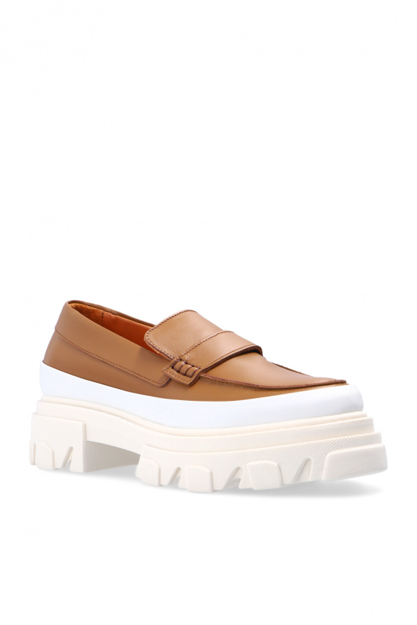 Brown and white moccasins from Ganni. Crafted from leather, this pair sits on a white chunky rubber sole and showcases exposed stitching details and a strap across the vamp.