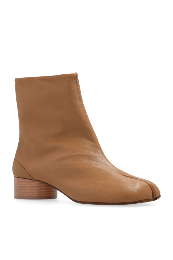 Introducing the exquisite Maison Margiela Tabi Leather Booties, a testament to avant-garde elegance and refined craftsmanship. These brown, beżowe booties captivate with their unique \"cloven\" toe design, a signature that sets them apart in the realm of high fashion. Crafted from premium, smooth leather with a subtle sheen, these booties are not just a statement piece but a tribute to luxury. The Tabi booties feature a sturdy, medium-height heel, perfectly color-matched to the boot, ensuring both comfort and style for everyday wear. The distinctive split-toe shape, visible even beneath the hem of jeans, is a bold fashion statement, while the seamless vertical seam running down the back to the heel adds a touch of sophistication. For ease of wear, they come equipped with hook fasteners, blending functionality with their unique aesthetic. Inside, the quality continues with a leather lining, promising comfort without compromising the boot\'s exclusive appearance. Although the designer\'s logo is discreet, the boot\'s distinctiveness speaks volumes of its Maison Margiela origins. Why Purchase These Tabi Booties? Unparalleled signature design with a split-toe feature for a standout look. Made from high-quality leather offering both luxury and durability. Comfortable medium-height heel suitable for daily wear. Hook fasteners for practicality and ease of use. Embody the essence of Maison Margiela\'s avant-garde elegance.