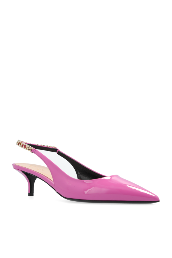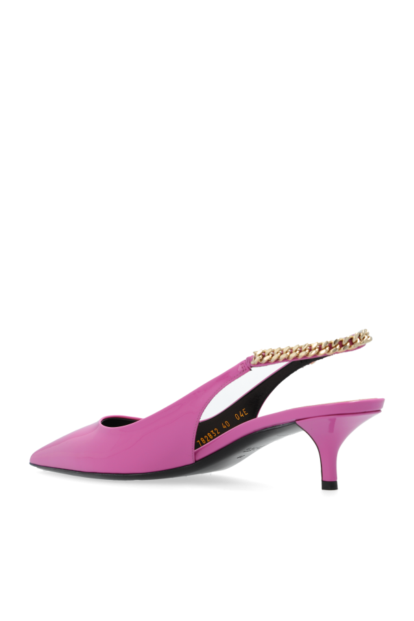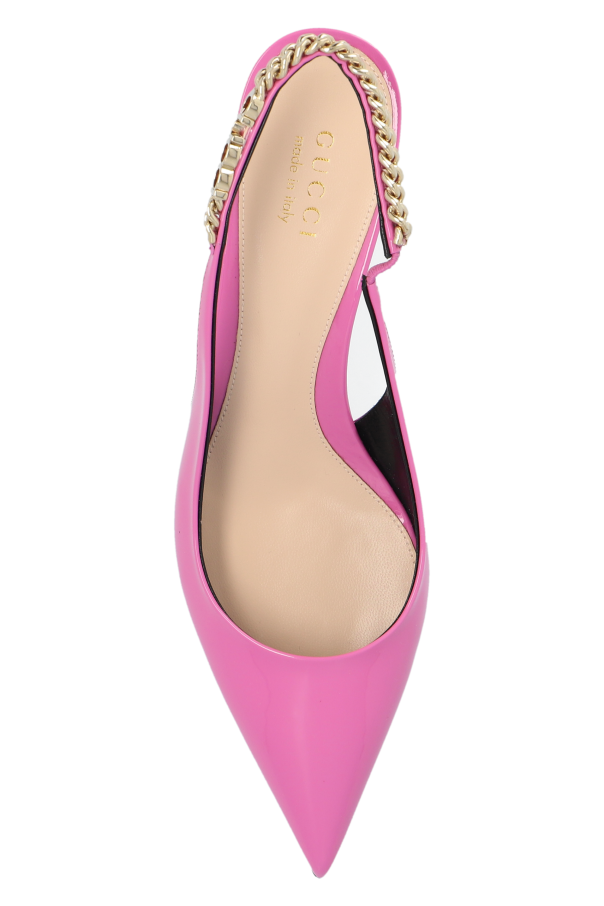 Introducing an epitome of elegance and refined taste, our pink high-heeled shoes by Gucci stand as a testament to luxurious footwear. Crafted with an unwavering attention to detail, these heels feature a sleek, pointed toe silhouette and a slender, low stiletto, encapsulating classic sophistication. The shoes are meticulously constructed from 100% polished leather, ensuring both durability and a lustrous finish. The distinguishing feature—a strap encircling the ankle, embellished with a delicate chain—adds a touch of distinctive allure, potentially signifying the hallmark of this renowned designer. The exposed heel and a gold-tone appliqué further accentuate the shoe\'s unique character, while the black leather sole is a nod to traditional craftsmanship. These heels are not just footwear; they are a statement of style, made from premium materials that speak volumes of their high-quality make. The entirety of the shoe, from the outer to the inner layer and down to the sole, is crafted in 100% leather, promising an experience of unmatched comfort and elegance. Why Purchase This Product? Made by the iconic fashion house Gucci, ensuring authenticity and exclusivity. Exquisite polished leather construction for a sophisticated look and longevity. Unique ankle strap with chain detail adds an elegant touch, setting this design apart. Versatile pink hue and sleek design suitable for various occasions, from formal events to casual outings. Represents a blend of traditional craftsmanship and modern aesthetics.