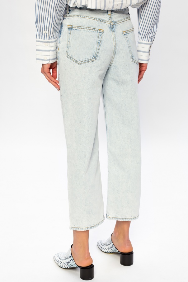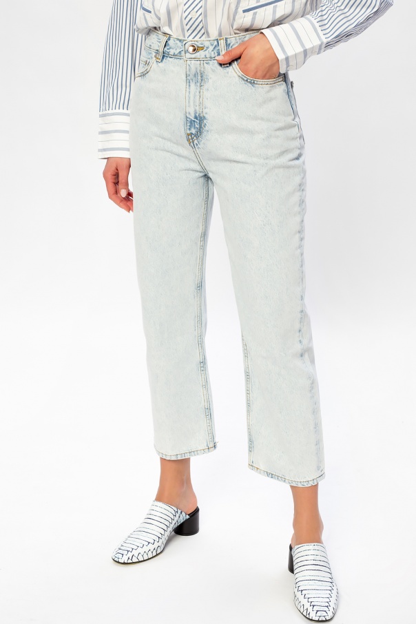 Light blue jeans from Ganni. Falling down with straight legs, this pair boasts a high-rise relaxed silhouette with a zip fly, a single button fastening and classic five pockets.