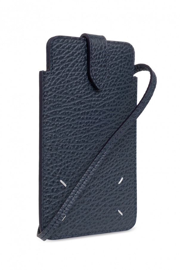 Navy phone case from Maison Margiela. Made of calf leather, this model features a snap closure, white logo embroidery, detachable and adjustable shoulder strap, one internal compartment and silver-tone metal hardware.