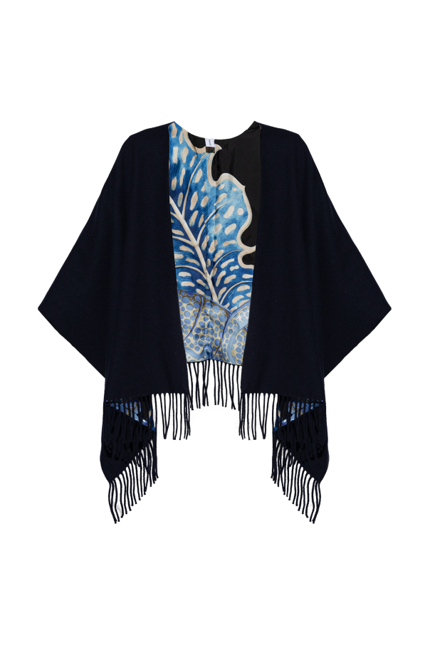 Reversible poncho in navy blue from FERRAGAMO. Crafted from a wool and cashmere blend and lined with black silk featuring a colourful floral print, this style is complete with a logo label stitched at the back and fringe detailing.