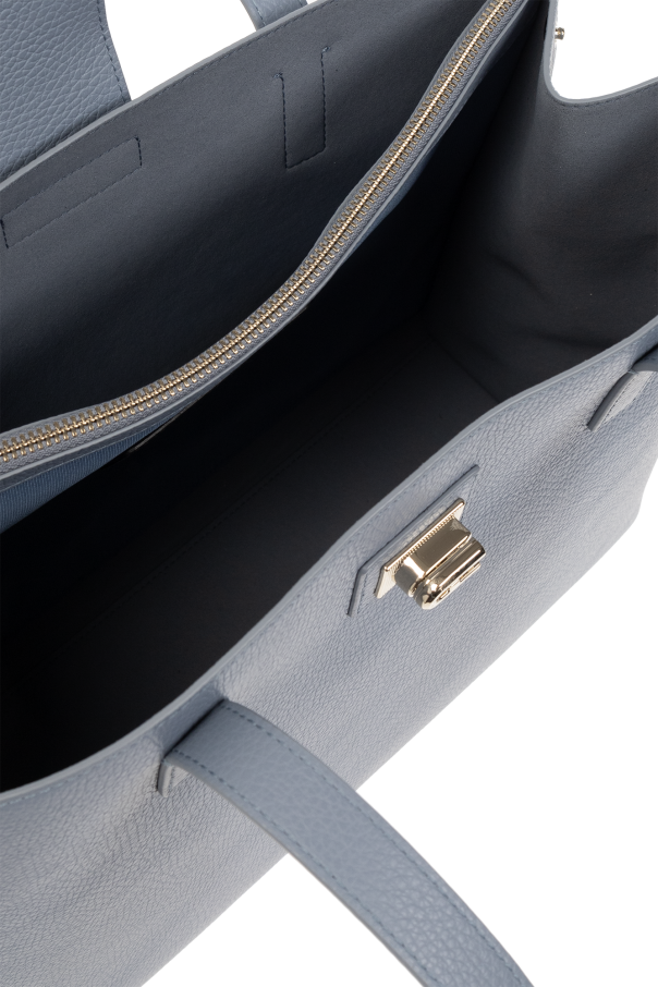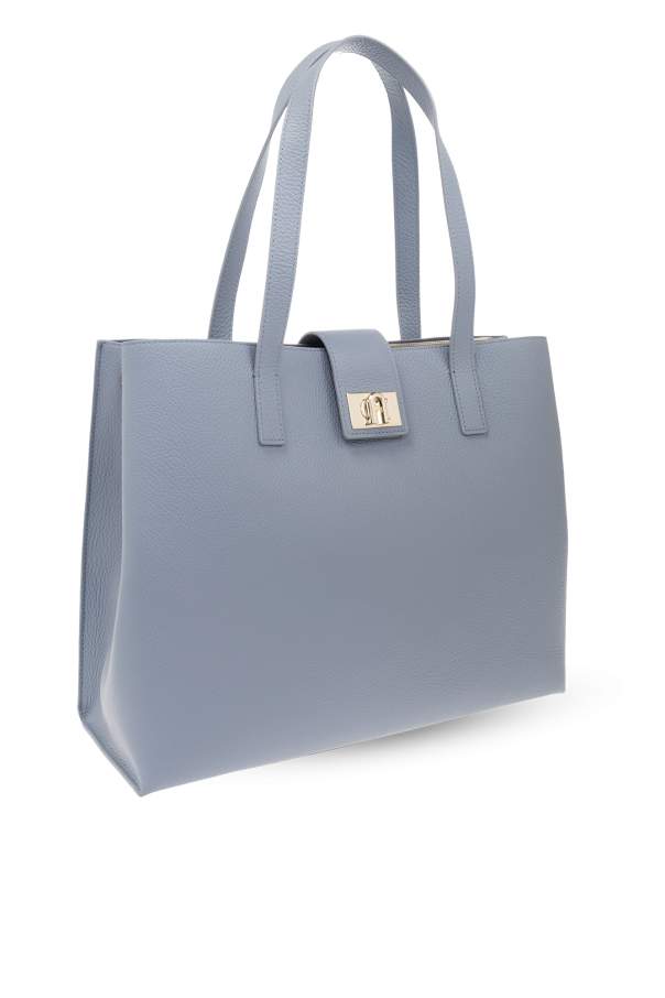 Blue ‘1927 Large’ shopper bag from Furla. Made of leather, this design secures with a logo-shaped twist fastener and features two half-round straps, gold-tone metal hardware and one internal compartment with one zip pocket and one slip pocket.