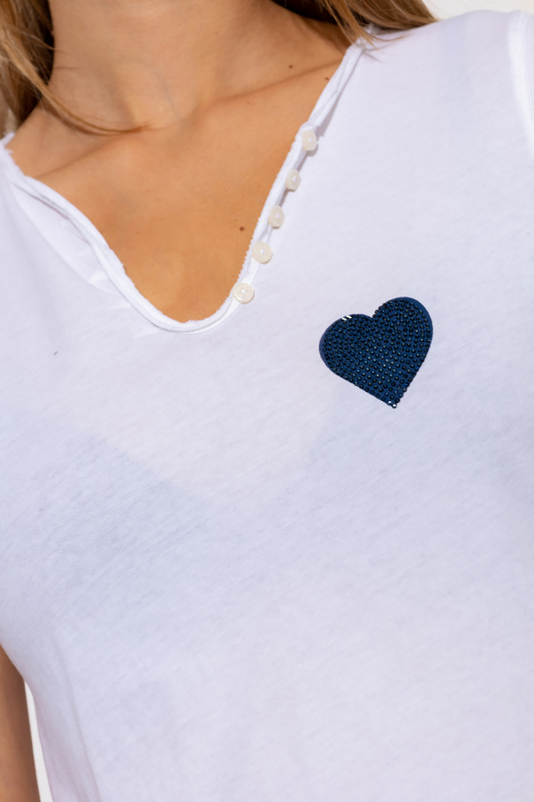 White ‘Henley’ T-shirt from Zadig & Voltaire. Made from cotton, this style features decorative button closures, short sleeves, raw hems and a colourful graphic print accentuated with glistening sequins.