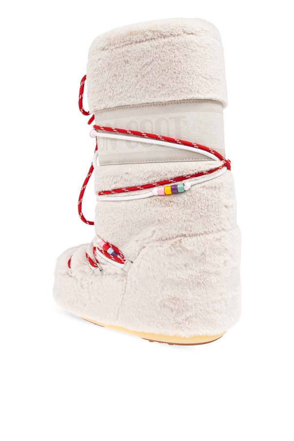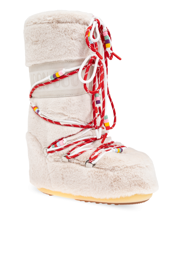 Introducing the sublime Icon Faux Fur Beads snow boots, a luxurious creation from the esteemed designer Moon Boot. These boots combine the functional excellence required for winter wear with an elegant and stylish aesthetic, making them a must-have for the discerning fashion aficionado. Crafted from sumptuous cream-colored faux fur, these boots exude warmth and sophistication. The plush material envelops your feet in unparalleled comfort, ensuring coziness during the harshest winter conditions. The design features a classic high shape that reaches mid-calf, accompanied by a wide shaft characteristic of this iconic footwear style. Adorned with striking red laces interwoven with vibrant beads, these boots are not only practical but also a statement piece. The laces wrap gracefully around the boots, culminating in a bow at the front, adding a touch of playful elegance. The prominent \"MOON BOOT\" branding at the top of the shaft signifies the heritage and quality of this renowned product. The light-colored rubber sole offers excellent traction, making these boots ideal for icy and snowy terrains. Their robust construction ensures they are well-suited for extreme winter conditions, providing both comfort and warmth. Why Choose This Product? Luxurious faux fur material for ultimate warmth and elegance. Classic high shape with a wide shaft for a timeless look. Decorative red laces with colorful beads for a unique, fashionable touch. Durable rubber sole ensuring excellent grip on snow and ice. Prominent \"MOON BOOT\" branding highlighting quality and style.