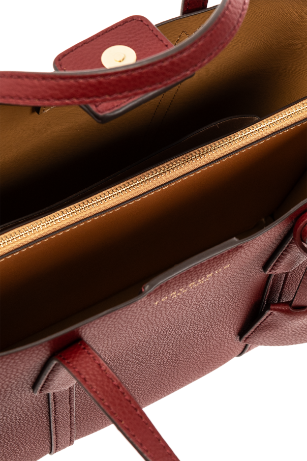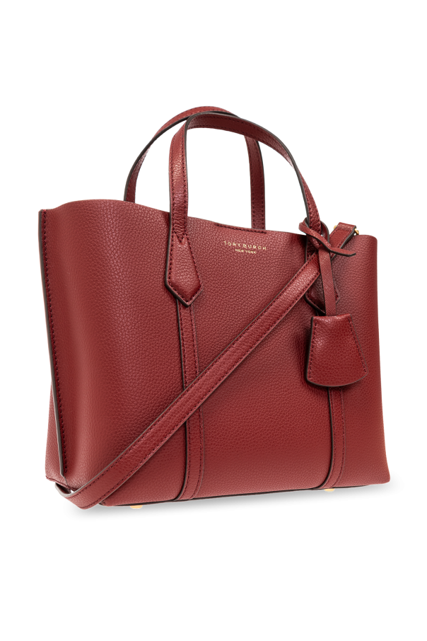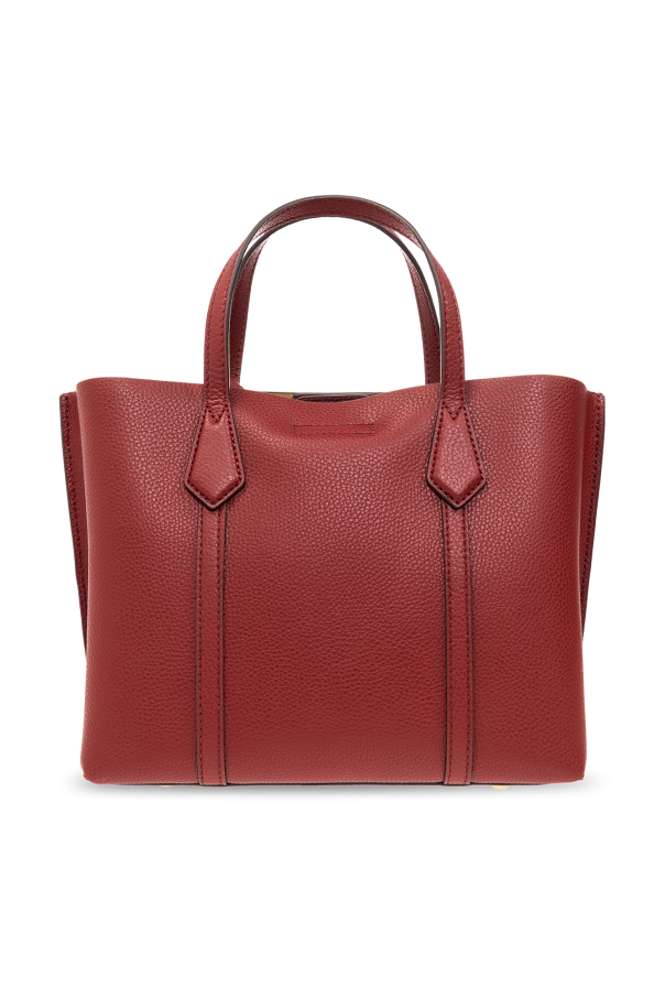 Maroon ‘Perry Small’ shopper bag from Tory Burch. Made from leather, this design secures with a magnetic snap and showcases a printed gold-tone logo on the front. It is complete with a detachable and adjustable shoulder strap, two half-round handles, gold-tone metal hardware and a beige-clad interior with two separate compartments, one zip pocket and one slip pocket.