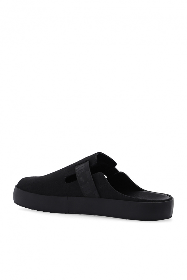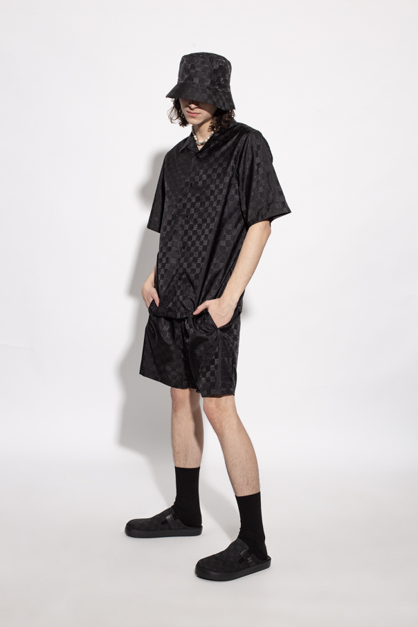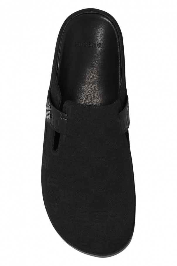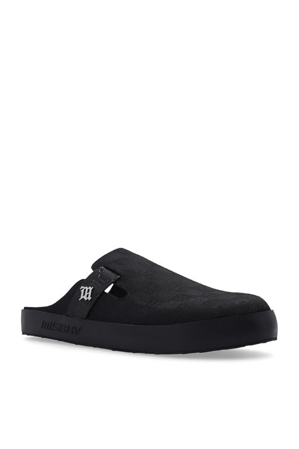 Black ‘The LA Slide’ slides from MISBHV. Crafted from fabric with the brand's jacquard ‘M’ monogram, this model features distinctive silver-tone metal hardware on the front and a black rubber sole with an embossed logo.