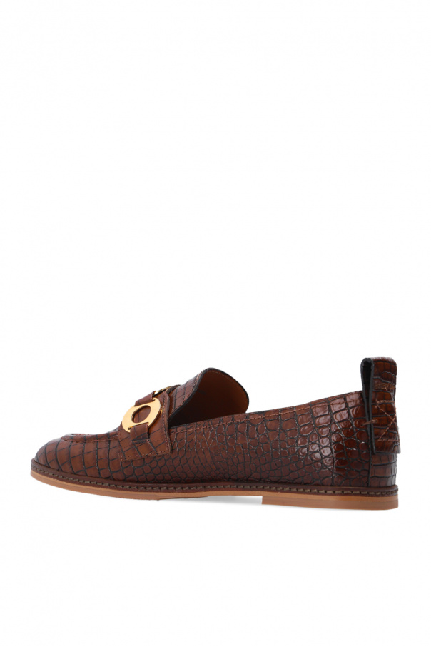 Brown loafers from See by Chloé. Crafted from leather with a crocodile skin effect, this model sits on a brown and beige rubber sole and showcases decorative gold-tone hardware with an embossed logo on the front.