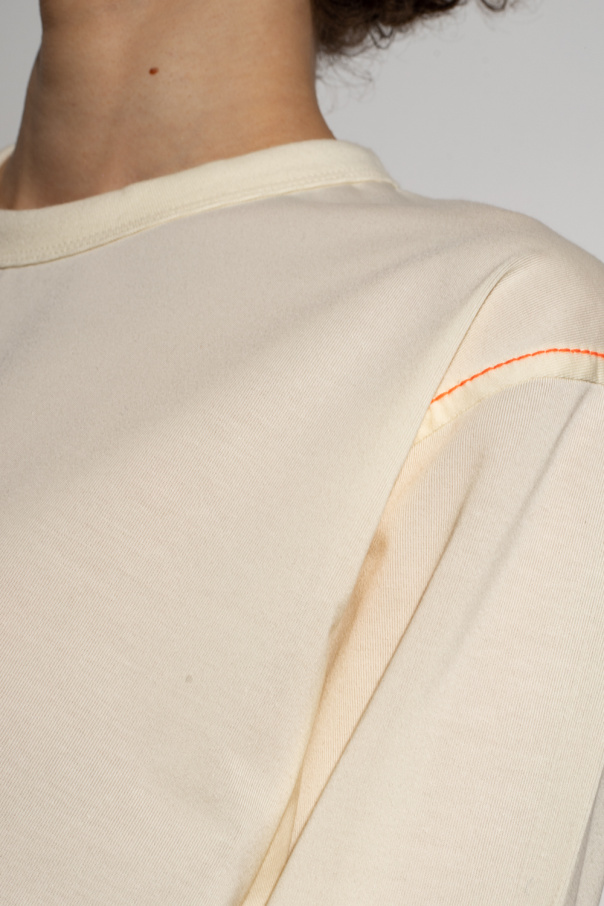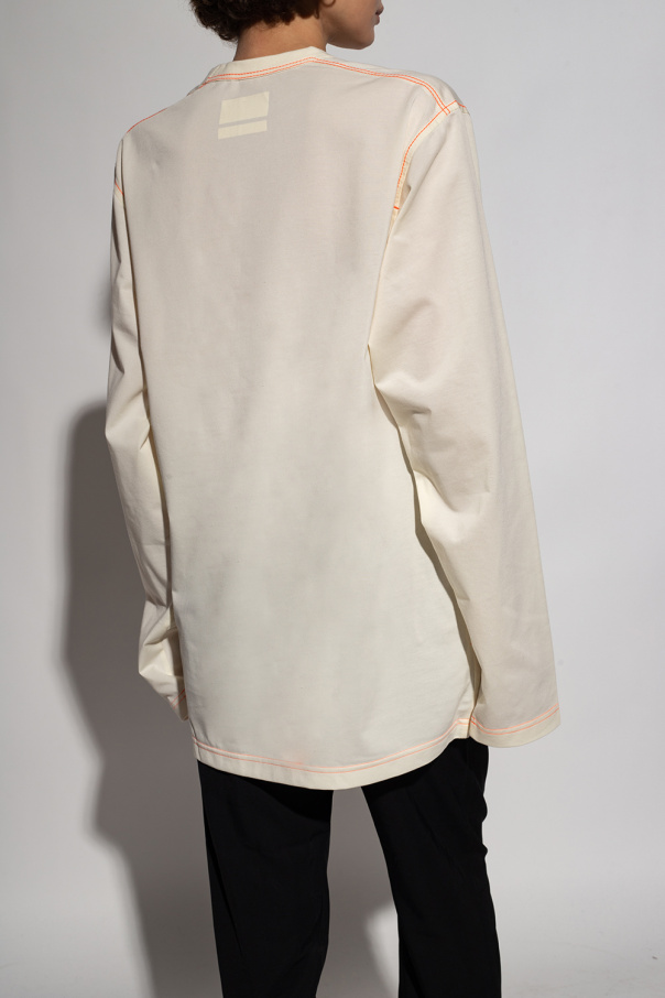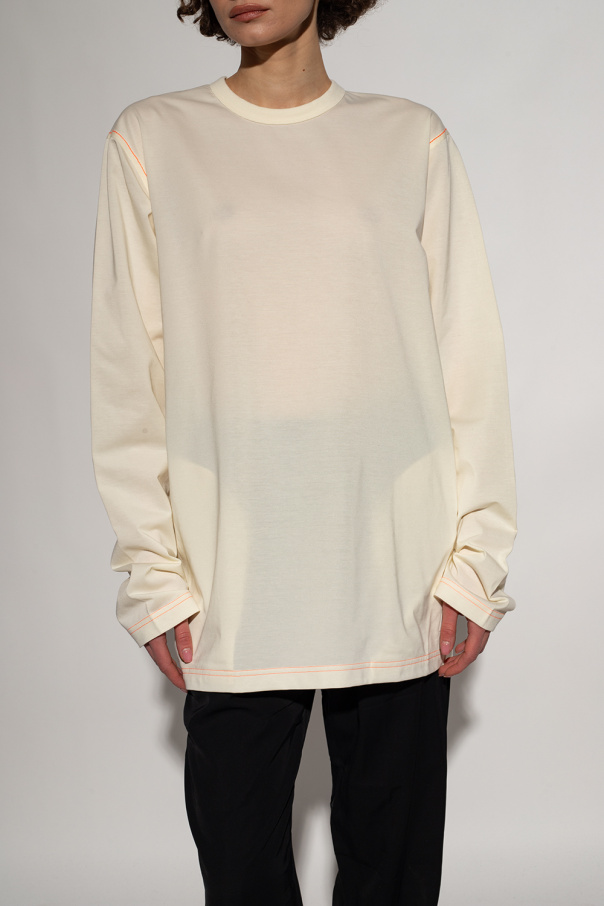 Cream crewneck T-shirt from Y-3 Yohji Yamamoto. Crafted from a blend of cotton and recycled material with an oversize fit, this style features an elasticated collar, long sleeves, two frontal slip pockets, contrasting red stitching details and a logo patch for brand recognition.