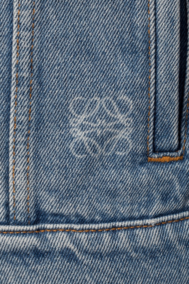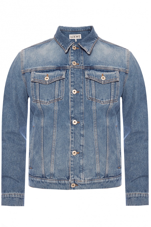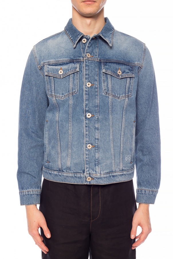 Blue distressed denim jacket from Loewe. Fastened with buttons. Decorated with a white logo print. Two slip pockets and two flap pockets fastened with snaps on the front.