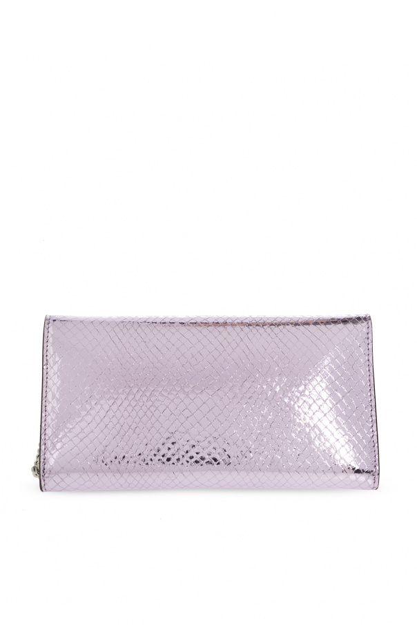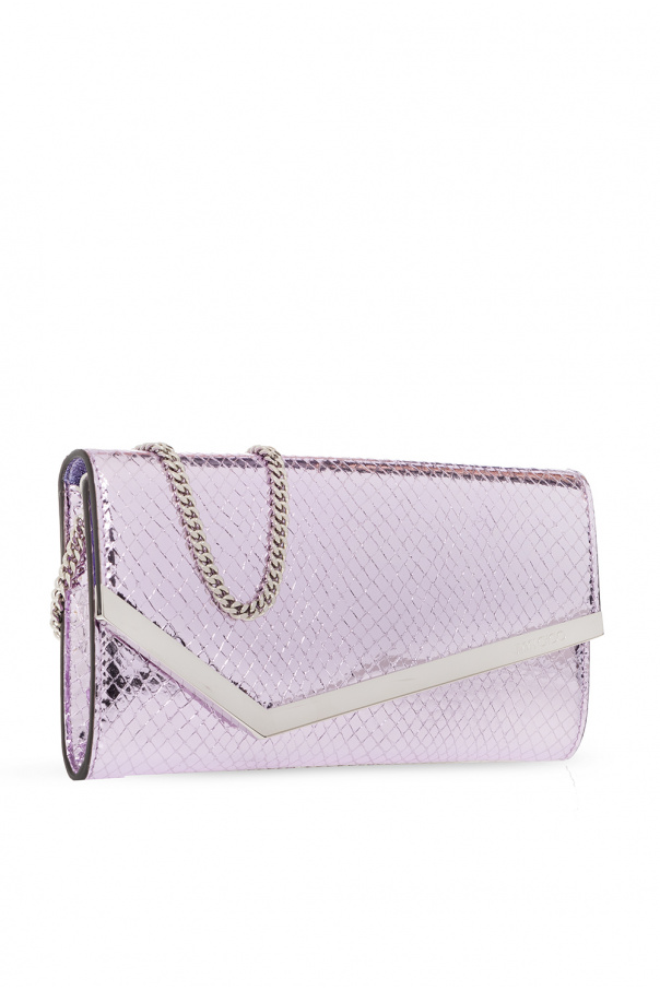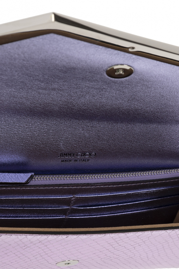 Light purple ‘Emmie’ clutch from Jimmy Choo. Made of lamb and goat leather with a snakeskin effect, this model fastens with a magnetic snap and is complete with a logo-engraved metal elements, detachable chain, silver-tone metal hardware and one internal compartment with light brown lining, six card slots, one slip pocket and one zip pocket.