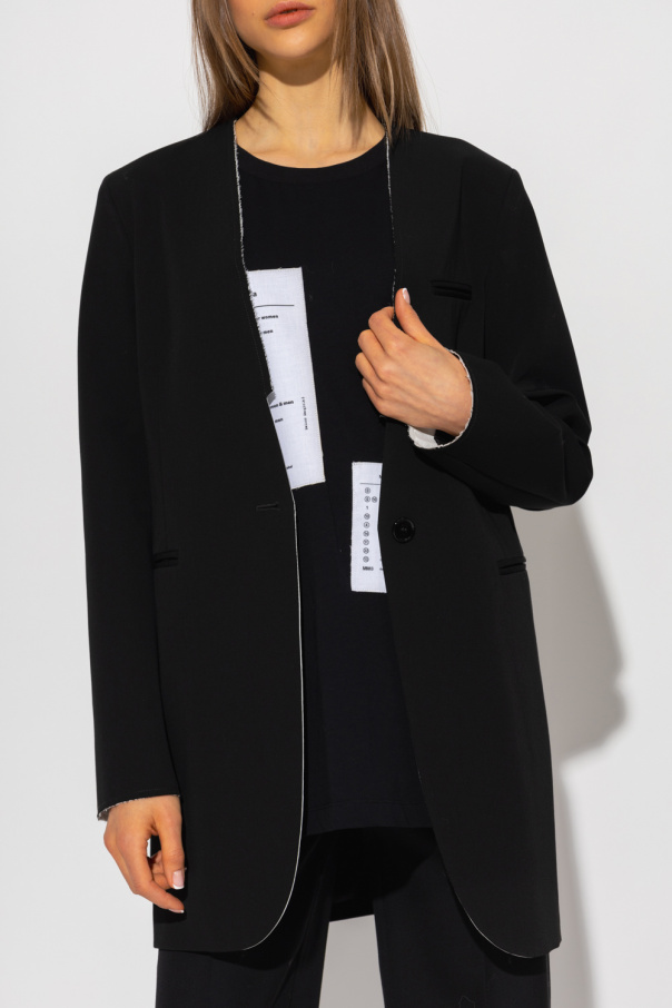 Black blazer from MM6 Maison Margiela. Cut with a single-breasted silhouette, this style features a single button closure, a V-neckline, three slip pockets, long sleeves and a single back vent.