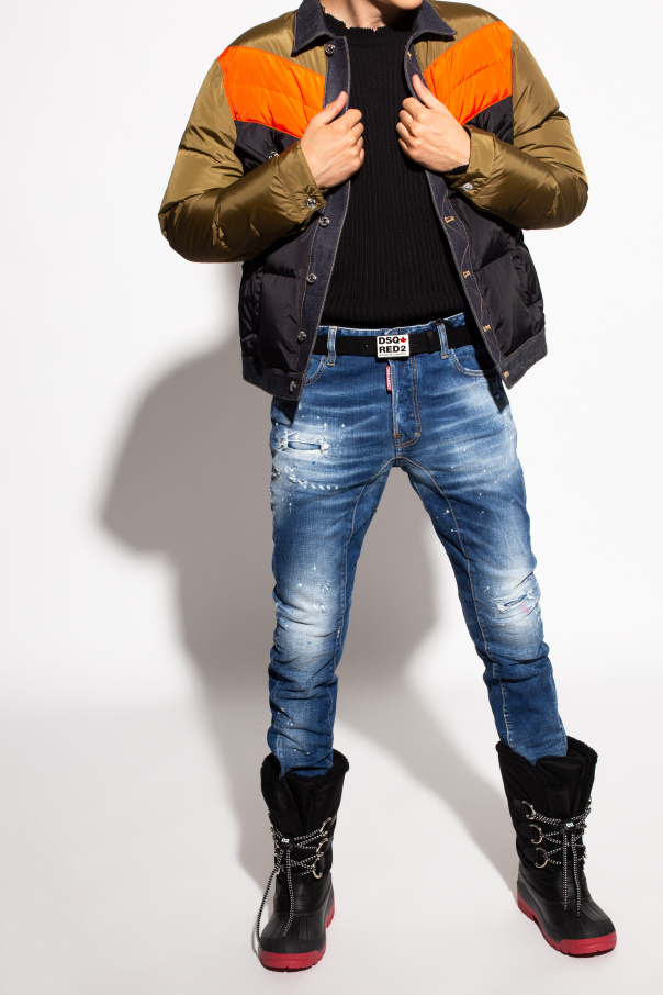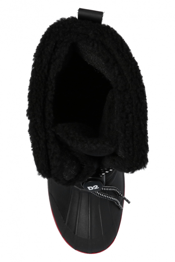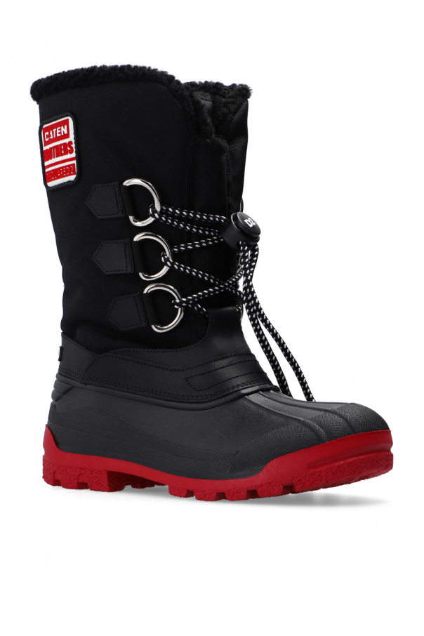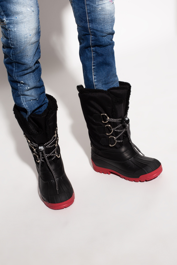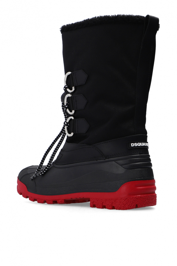 Black insulated snow boots from Dsquared2. Trimmed with leather, this pair features black and white lacing, black and white patch with red lettering as well as a rubber sole in red and black.