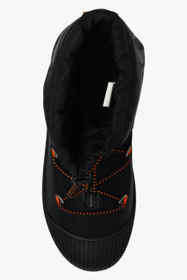 Black ‘Mtrack Polar’ insulated snow boots from Moon Boot. Crafted from water-repellent material, this model showcases a fast lacing system, a printed grey logo, rubber trims, orange inserts, a thermoplastic midsole and a black rubber outsole.