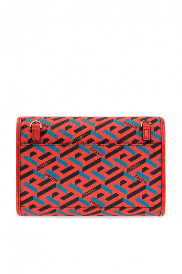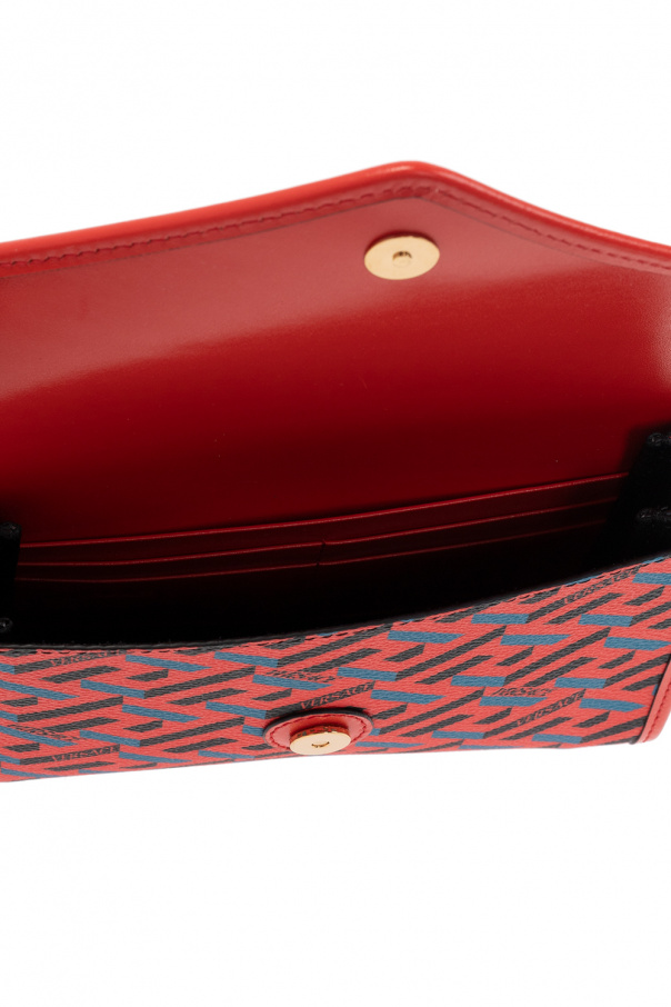 Red, black and blue ‘La Greca’ shoulder bag from Versace. Crafted from canvas with leather trims, this model features a magnetic snap closure, back pocket, detachable chain, gold-tone metal hardware and one internal compartment with one slip pocket and four card slots.