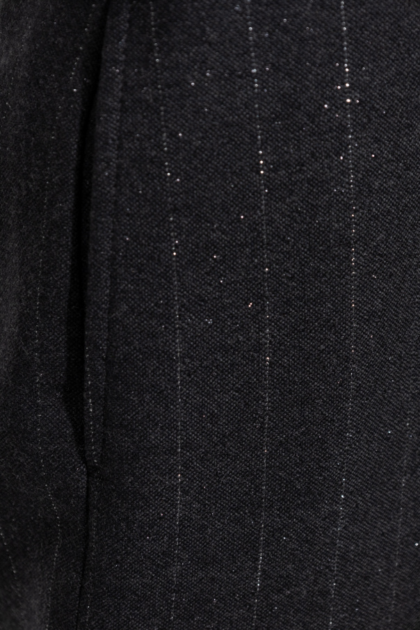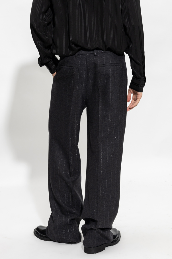 Dark grey trousers from Saint Laurent. Made of wool, this garment features a zip, hook and button closure, pinstripe pattern with silver-tone lurex threads, two back and front pockets and straight, wide, pleat-front legs.