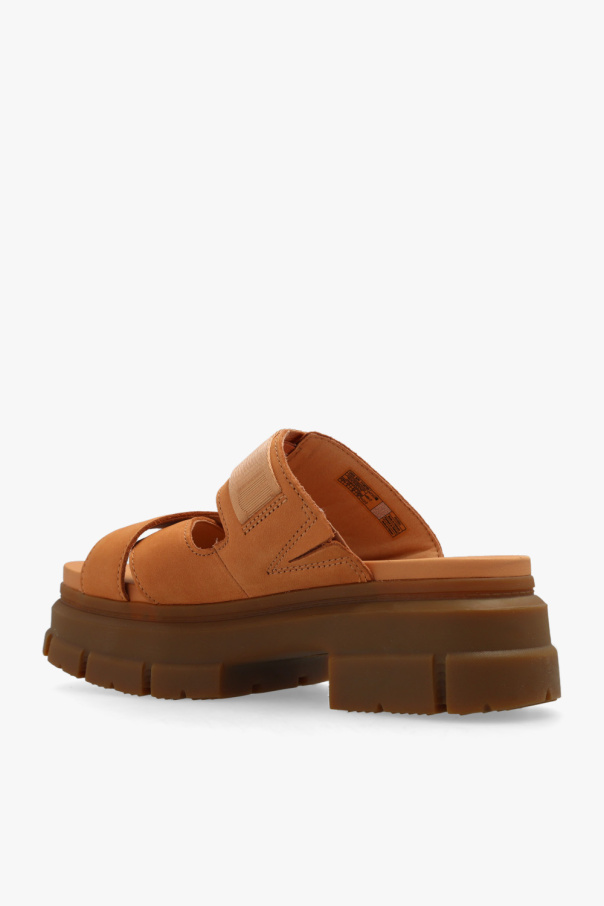 Beige ‘Ashton’ platform slides from UGG. Crafted from nubuck, this model sits on a brown rubber sole and features an adjustable velcro strap with a logo.