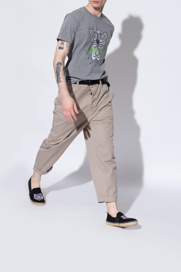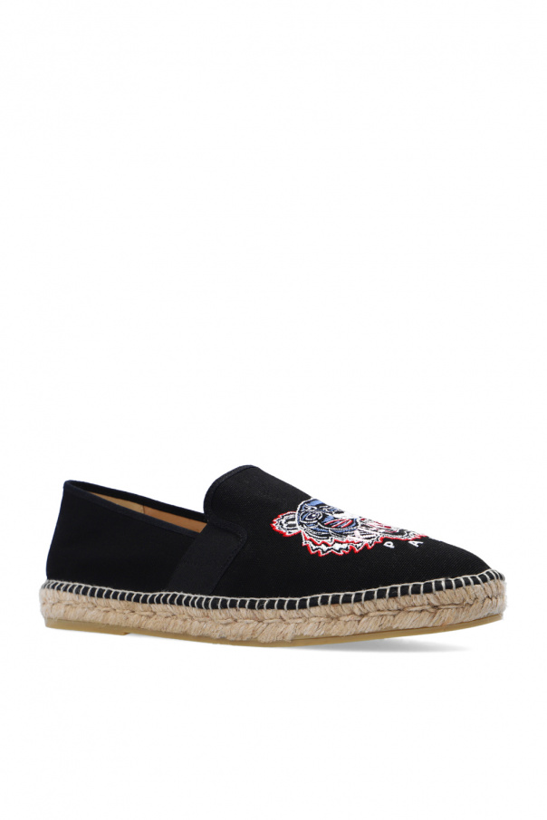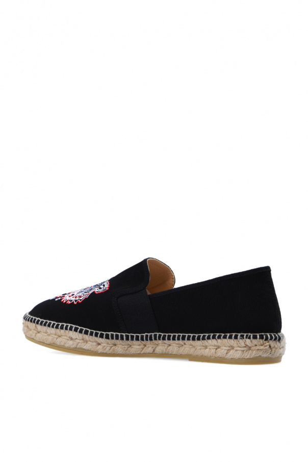 Black and beige espadrilles from Kenzo. Made of cotton, this garment features the brand’s signature multicolored tiger head motif, elastic waistband and beige rubber sole.