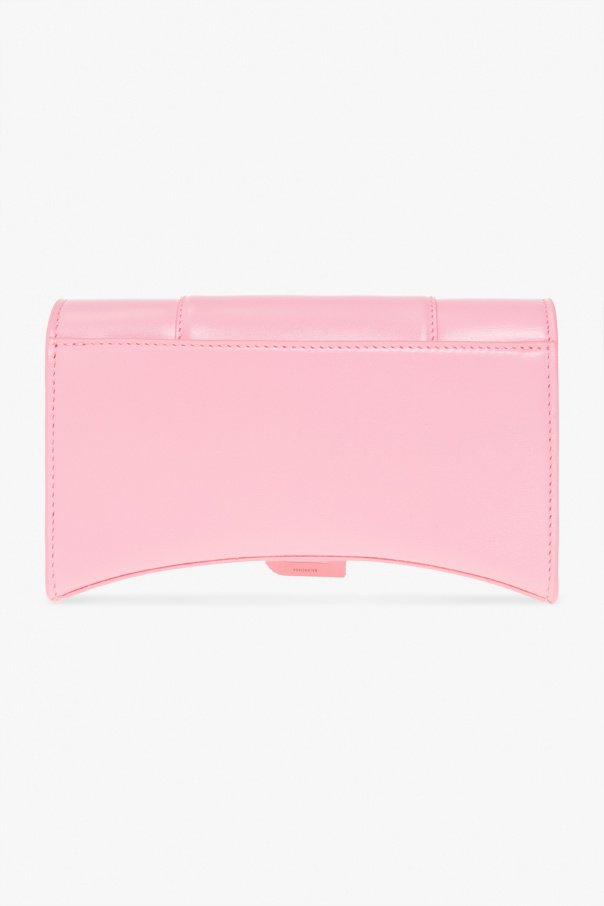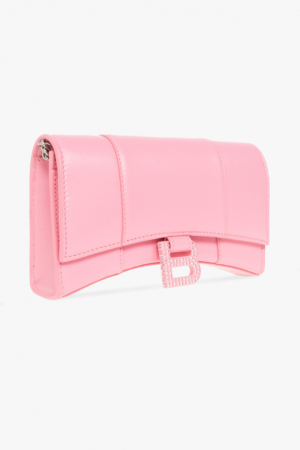 Pink ‘Hourglass’ wallet from Balenciaga. Made of calf leather, this model features a snap closure and is decorated with a logo charm embellished with crystals. It is complete with a back pocket, detachable shoulder chain, silver-tone metal hardware and one internal compartment with two slip pockets, one zip pocket and six card slots.