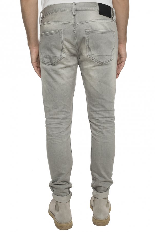 Light grey jeans, \'Cigarette\' model from AllSaints. Fastened with buttons. Five inset pockets: three on the front and two on the back. Tapered legs.