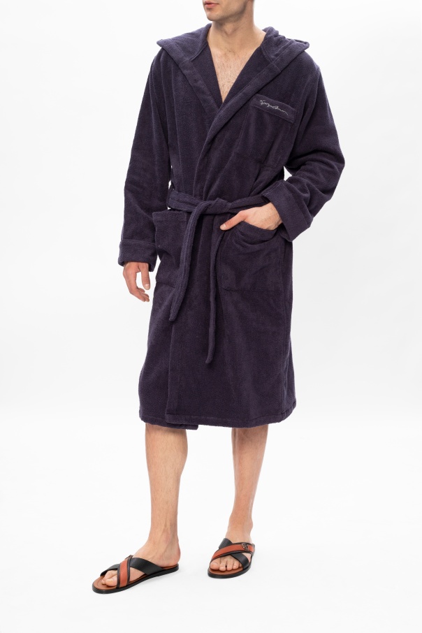 Black and brown slides from Giorgio Armani. Crafted from textured leather, this design features a silver-tone logo element and a black rubber sole.