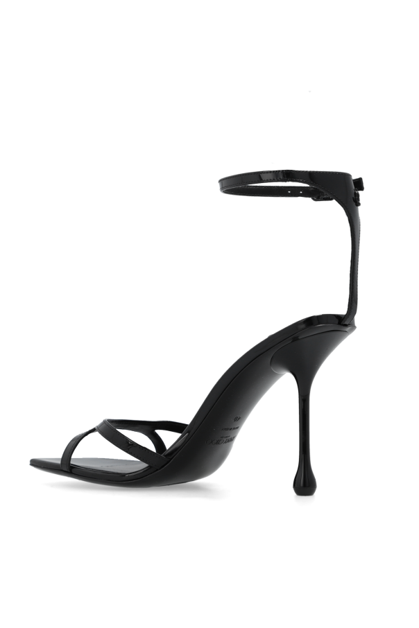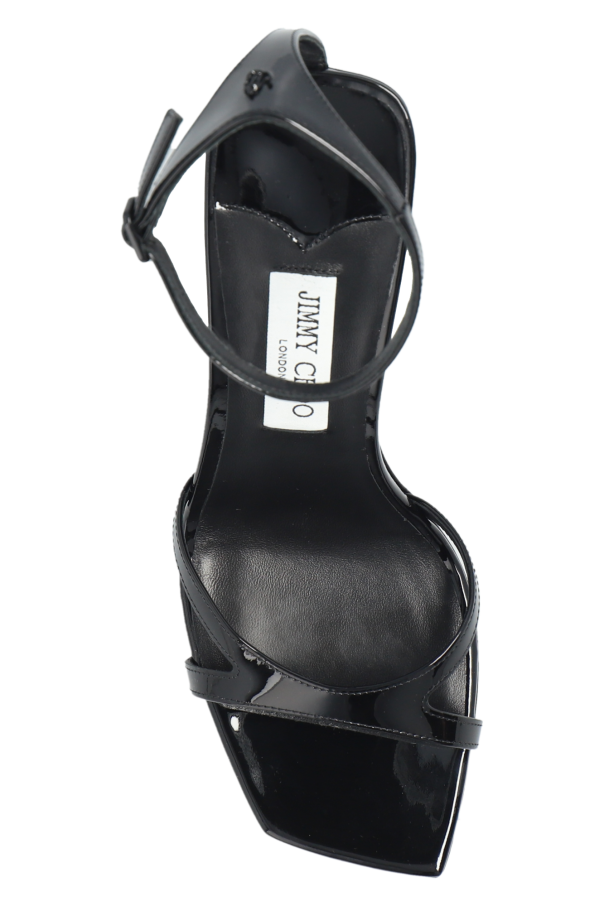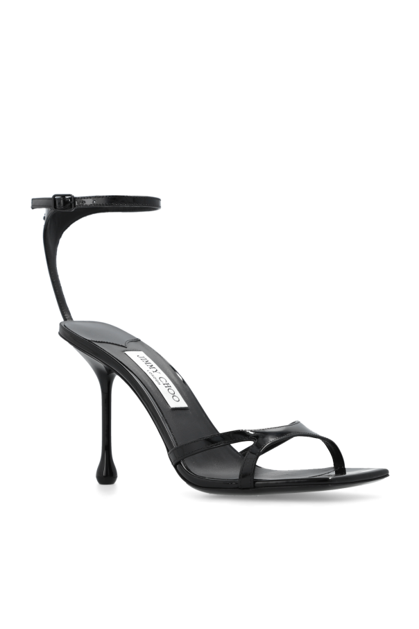Black ‘Ixia’ heeled sandals from Jimmy Choo. Made of patent leather, this pair rests on a black leather sole trimmed with rubber and features an adjustable buckled ankle strap, metal logo detail and a square toe.