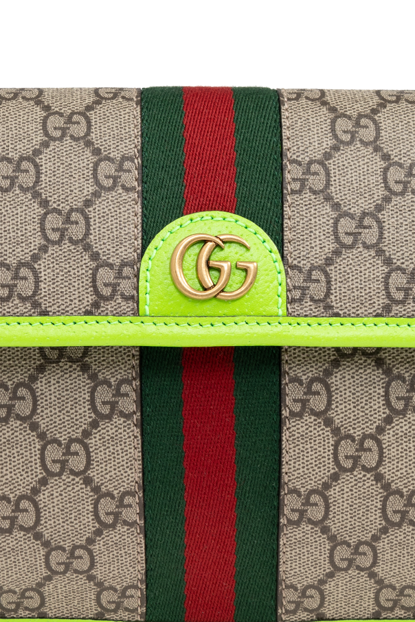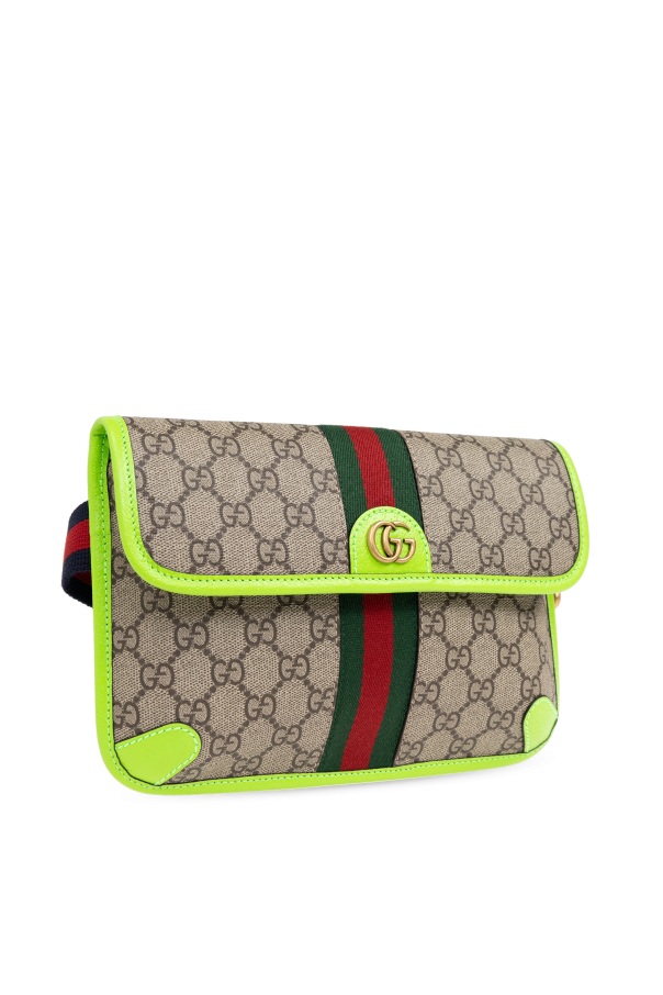 Introducing the \"Ophidia\" men\'s belt bag, an epitome of luxury and functionality from the renowned designer, Gucci. This exquisite accessory is designed to cater to the discerning gentleman who values both aesthetics and practicality in his wardrobe. The bag\'s dominant beige hue, adorned with the iconic \"GG\" monogram pattern, exudes sophistication, while the signature green and red stripes add a touch of elegance. The front flap of the bag showcases a circular, bold designer logo in green with a metallic gold finish, further elevating its allure. The neon green accents around the edges and flap introduce a contemporary contrast to its classic design. Crafted from calfskin leather and \'GG Supreme\' canvas, the outer layer of the bag promises durability and potential resistance to weather conditions, making it an ideal companion for the urban explorer. The interior, lined with green fabric, underscores the bag\'s cohesive color scheme and offers a spacious compartment for essentials. A serial number tag inside ensures authenticity. The bag\'s rectangular silhouette with pronounced edges, secured with a magnetic snap closure, and an adjustable shoulder strap with a robust buckle, underscores its practicality and ease of use. Why Purchase This Product? Elegant design with distinctive Gucci green and red stripes. Durable materials including calfskin leather and \'GG Supreme\' canvas. Contemporary neon green detailing for a modern twist. Adjustable, sturdy shoulder strap for customized fit and comfort. Magnetic snap closure for secure and easy access.