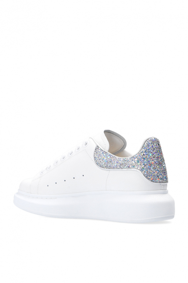 White sneakers from Alexander McQueen. Crafted from leather and fabric, this lace-up model sits on a white rubber sole and features an embossed silver-tone logo and a glittery silver-tone insert at the back.