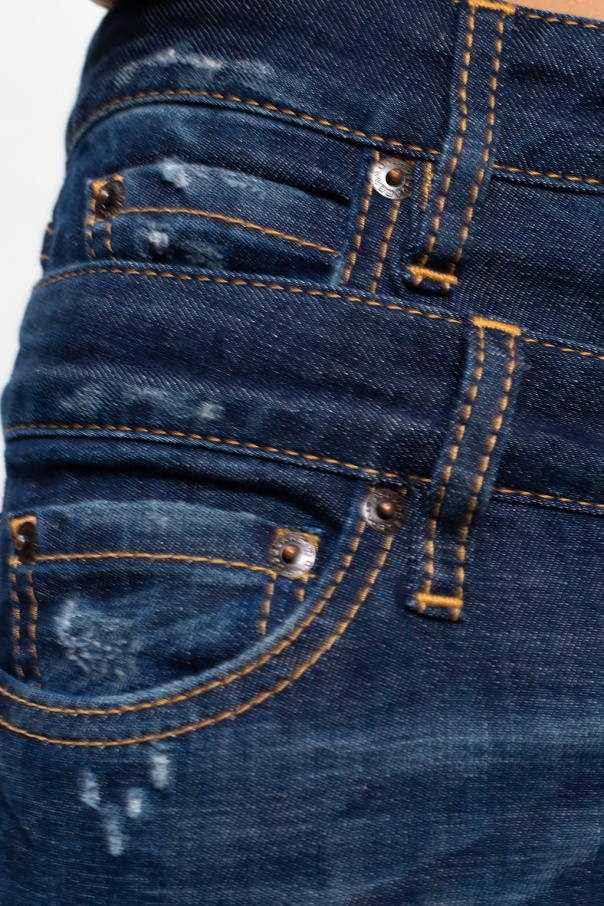 Navy ’Twin Pack’ distressed jeans from Dsqaured2. Fastened with a zip and buttons, this tapered leg design features two front pockets, two back pockets, a raw edge and lining with shorts.