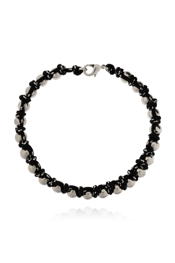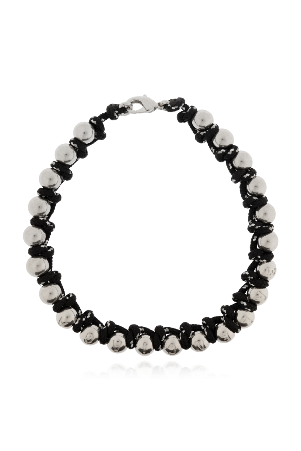 Introducing the Choker with Logo, an exquisite creation from the prestigious fashion house Balenciaga. This masterpiece eloquently marries timeless elegance with modern flair, making it an impeccable accessory for both refined and casual ensembles. Crafted with meticulous attention to detail, the choker features uniformly arranged spherical elements, each exuding a lustrous silver sheen. These spheres are intricately interwoven with a contrasting black cord, enhancing its visual appeal with a striking pattern. The use of brass material ensures durability while maintaining an air of sophistication. The choker is elegantly secured with a metal lobster clasp, facilitating effortless adornment. Its unisex design ensures versatility, complementing a myriad of styles and occasions. Why Choose This Product? Designed by the renowned fashion house Balenciaga. Perfect blend of classic elegance and modern style. Unisex design suitable for any occasion. Easy-to-use lobster clasp closure. Distinctive contrast of silver and black for added allure.