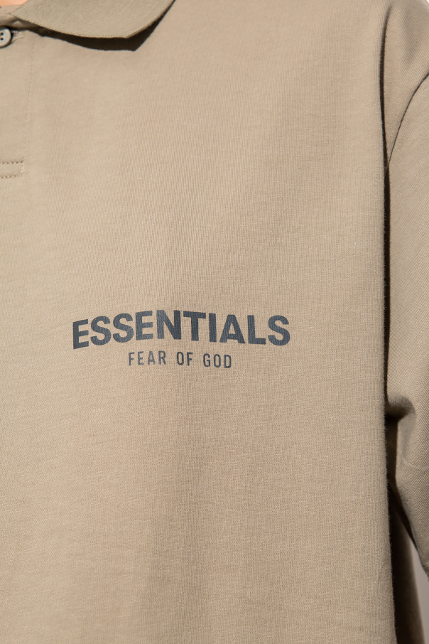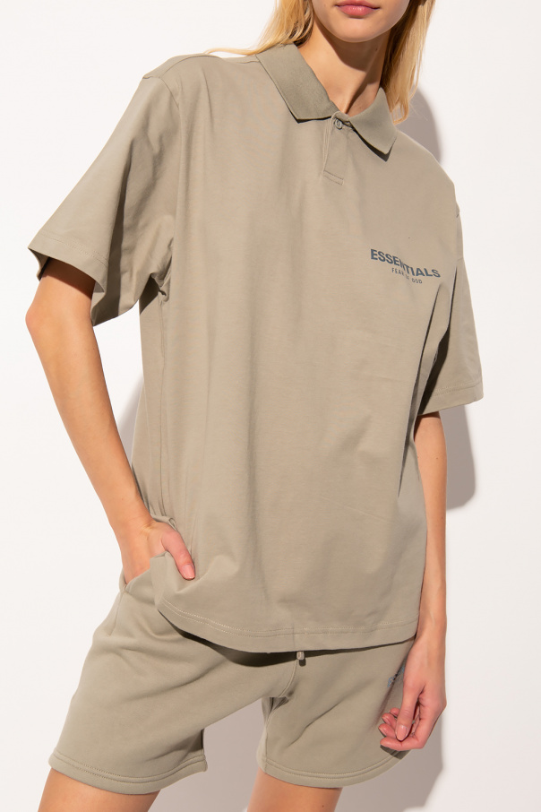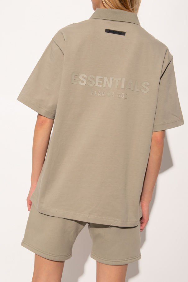 Greyish green polo shirt from Fear Of God Essentials. Crafted from cotton, this short sleeve design features button fastenings, silver-tone reflective logo print and a rubber appliqué at the back.