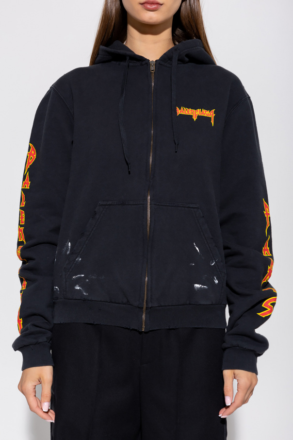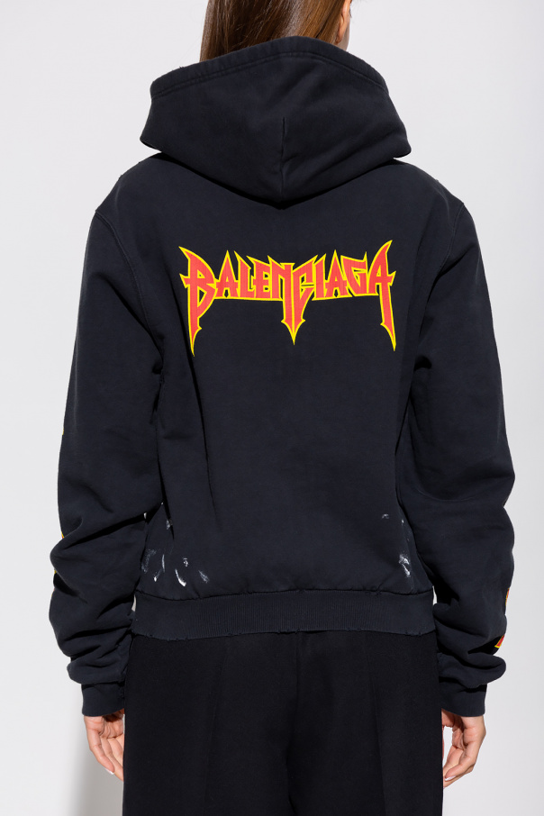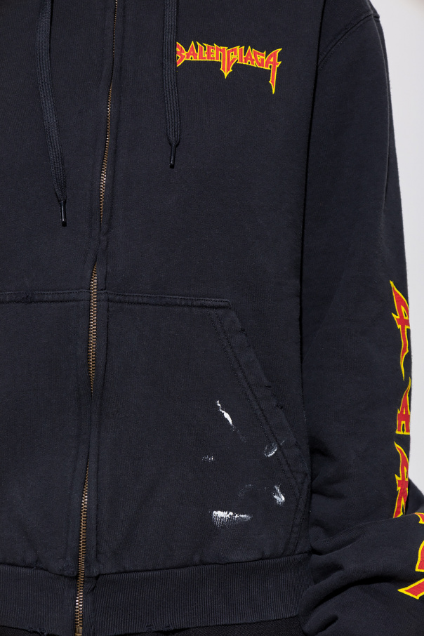 Black sweatshirt with a drawcord-adjustable hood from Balenciaga. Crafted from cotton jersey, this style features a zip fastening, red and yellow cracked ‘Metal’ logo prints on the front, back and sleeves, a white paint splatter effect on the bottom, two slip pockets, distressed detailing, a vintage treatment and elasticized trims on the bottom hem and cuffs.