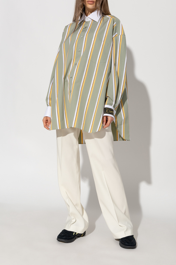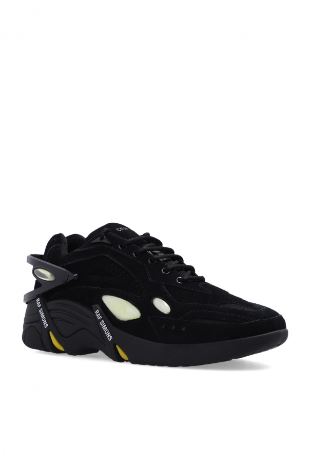 Black ‘Cylon-21’ sneakers from Raf Simons. Made of suede with perforations, this lace-up pair features light yellow rubber trims, a raised logo, white appliqué and rubber sole in cream.