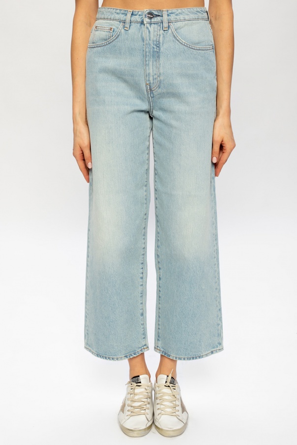 Light blue ‘Flair’ jeans from Toteme. Sporting a logo-embossed patch on the back, this pair falls down with flared legs and features zip fly, button fastening and classic five pockets.