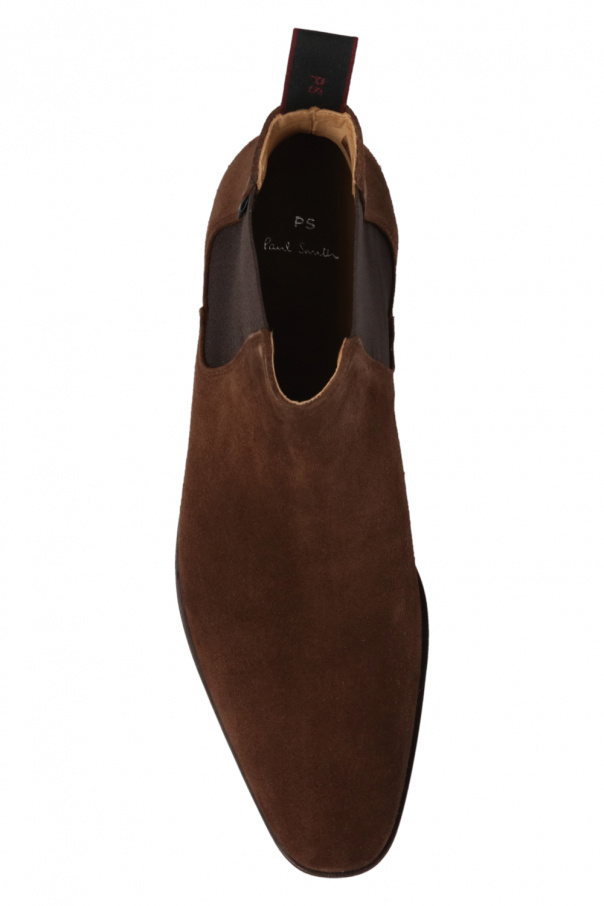 Brown ‘Gerald’ ankle boots from PS Paul Smith. Crafted from suede, this slip-on pair is complete with elastic side panels with a logo tag, logo motif at the heel strap and brown sole made of leather and rubber.