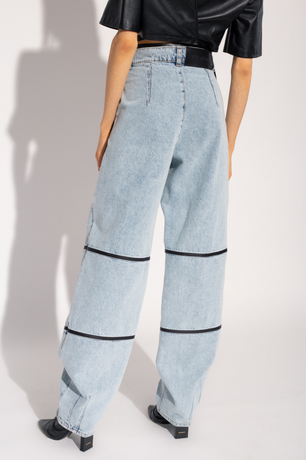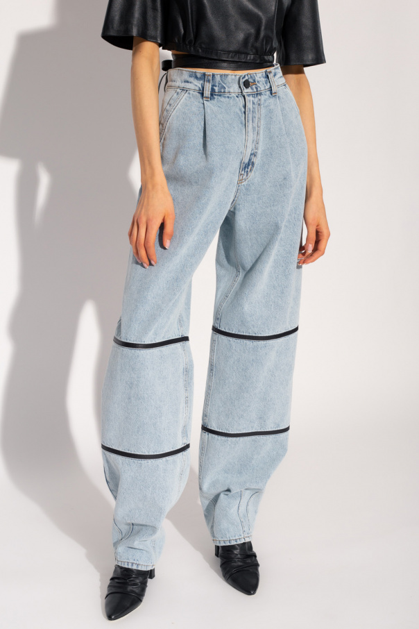 Light blue ‘Seres’ jeans from The Mannei. Distinguished by leather accents, this pair features a zip fly with a button, two slip pockets, a logo-embossed back patch, a vintage effect and legs that taper towards the ankles.