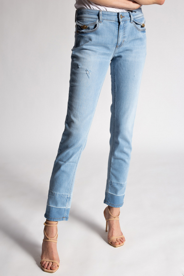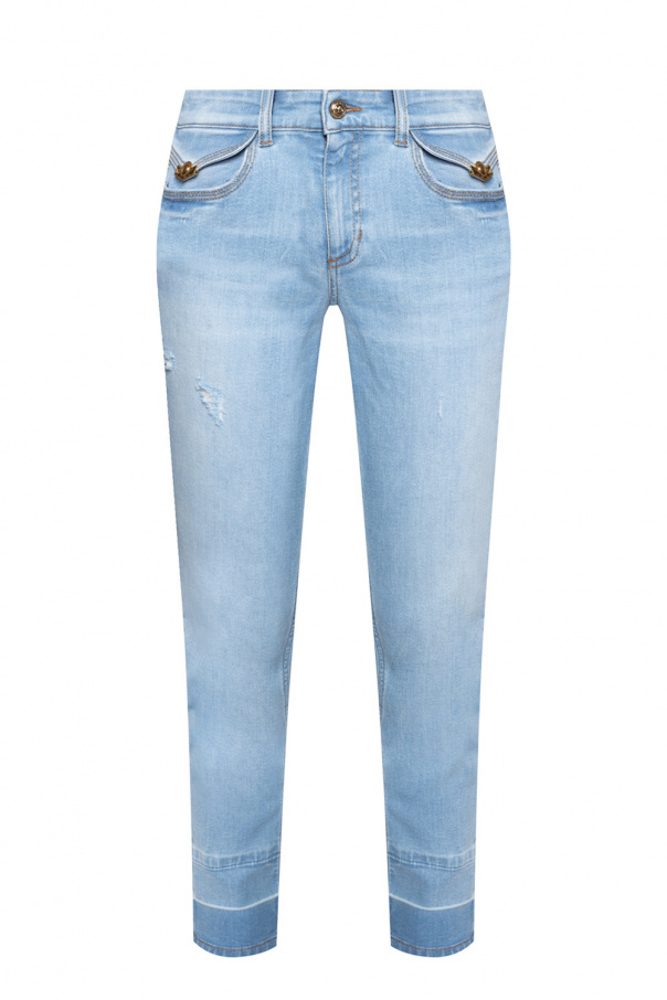 Blue jeans from Versace Jeans Couture. Falling down with straight legs, this pair features a zip fly with a button, four pockets, a stonewashed treatment, a logo patch, yellow stitching details, raw trims and gold-tone metal hardware with the brand\'s logo.