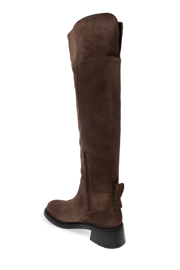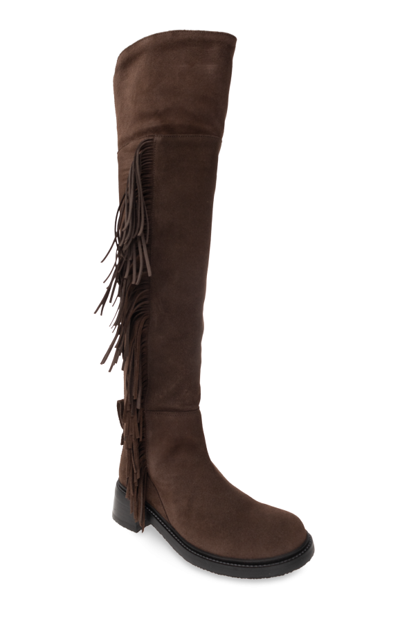 Dark brown ‘Joice’ suede boots from See By Chloe. Made of suede with a round toe, this model sits on a black rubber sole and features a side short zipper and fringe detailing.