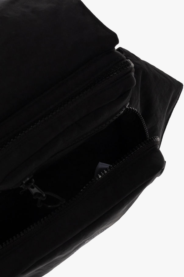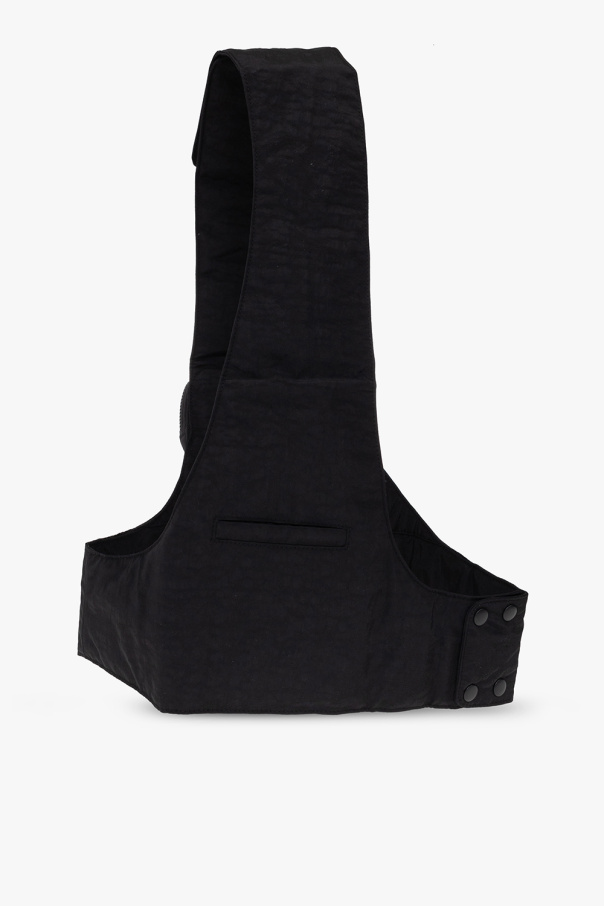 Black belt with pouches from A-COLD-WALL*. Two pouches fasten with a two-way zipper. One has a blue logo print on the front. The smaller one features a zip pocket on the front. The design is complete with a wide shoulder strap with a velcro closure and snap fastenings.